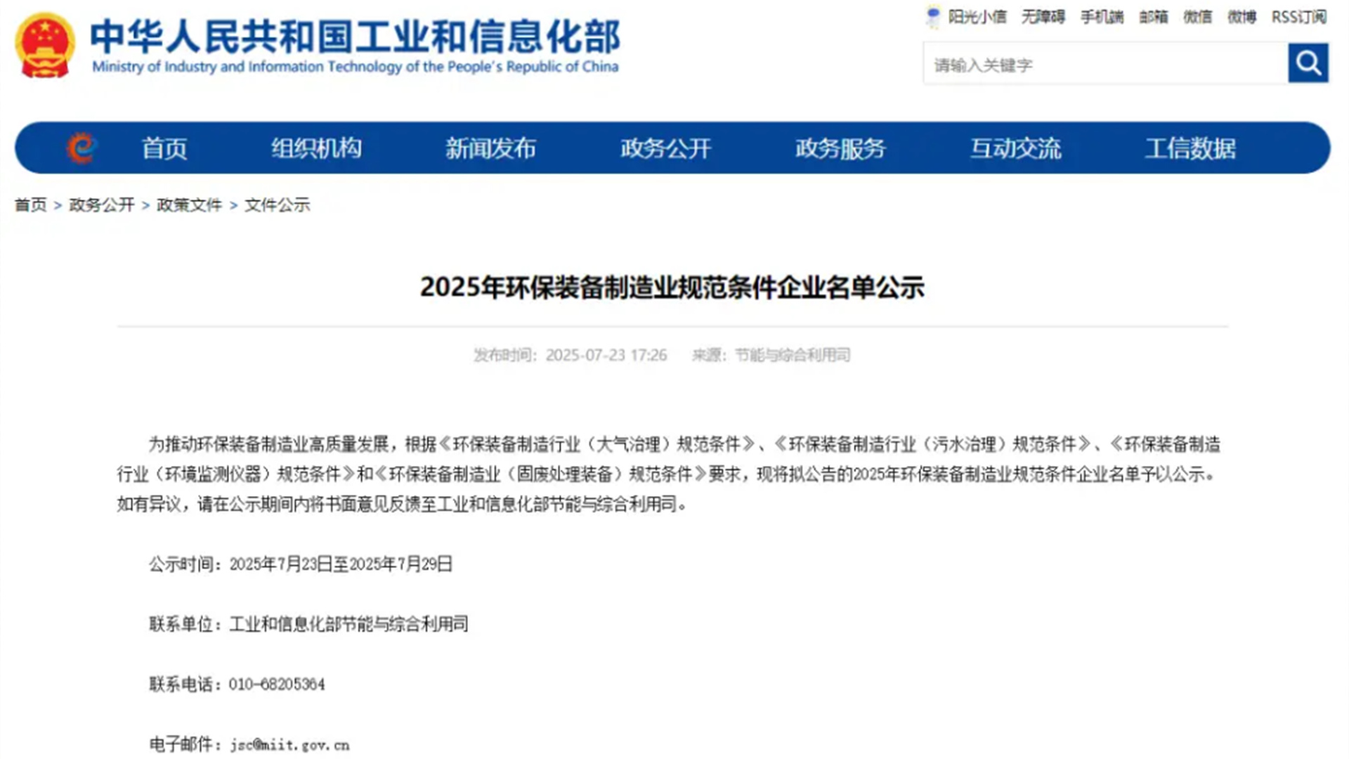 近日,工業和信息化部公示了《2025年環保裝備制造業規范條件企業名單》…